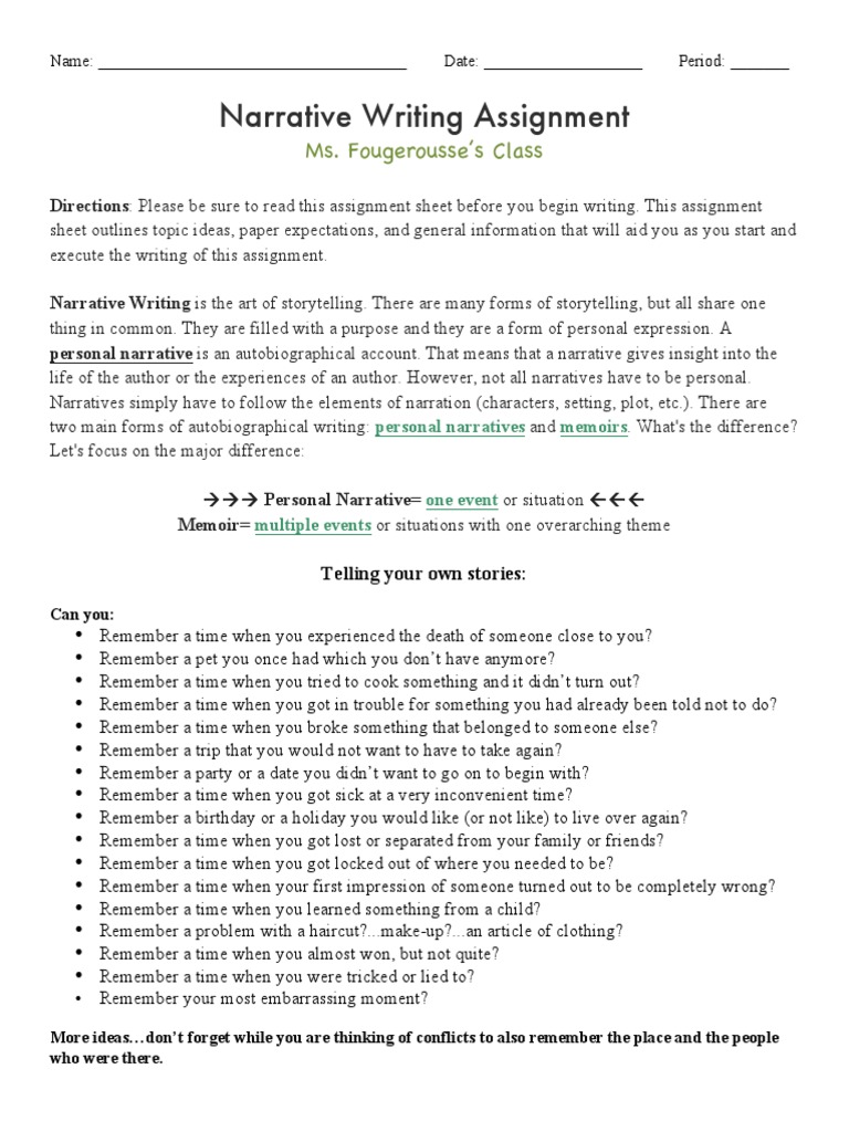 · Narrative Essay Assignments – Comprehensive Guide Whether or not you’re in a school or college, you likely experienced writing narrative essays in your assignments. The narrative essay is such an essay wherein a writer needs to take a specific position and some time later show it with the help of raising a sharp and solid request Narrative Essay Worksheets & Writing Assignments. Don’t Tell, Show Activity: Beginning writers are more likely to tell readers how a character is feeling, rather than showing them. This writing worksheet gives students practice with showing and not telling. In this activity students take twenty telling statements and turn them into showing Narrative essay writing is one of most complex yet mastered when once grasped essay writing topics. Students who doesn’t have penchant or understanding will suffer from problems while writing the narrative essay assignments. But those students don’t have to worry anymore. We provide best services that you can find and also the most reliable