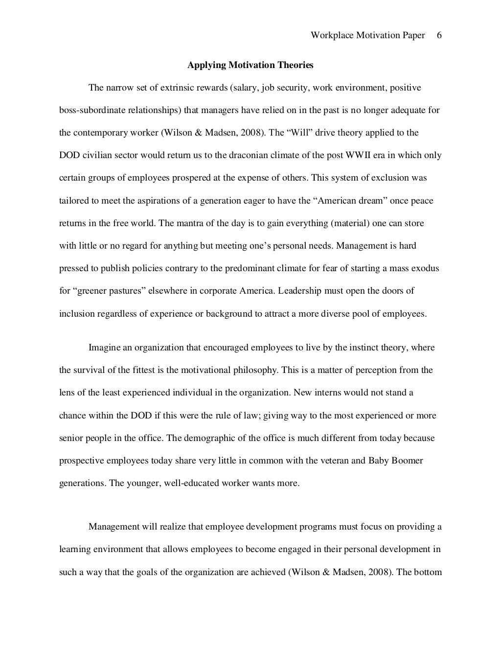 Workplace Motivation Paper When looking at today 's workplace, teams have become one of the most popular organizational methods in developing projects. There is an enduring aspect of teams that makes it powerful and great. But we should not forget to incorporate motivational strategies, in order to intensify the process By writing this motivation paper I will come up with various motivation theory along with some experience regarding motivational situations what I felt including how motivational theories are applicable to the working environment, and how businesses can actualize the hypotheses to guarantee upbeat and spurred representatives · 1 Place of work Motivation Document Essay Samples 2 Motivational Strategies and their Effects on Productivity 3 Workers’ Opposition to Increasing Productivity 4 The Administration’s Philosophy of Inspiration 5 The Effects of the use of Motivational Theories 6 Bottom line 7 References 8 Peter Harris